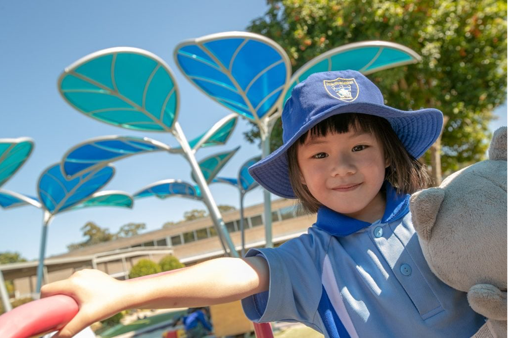 A young girl in a blue school uniform and sunhat smiles outdoors while holding a stuffed animal. Blue leaf-shaped structures and trees are visible in the background on a sunny day.
